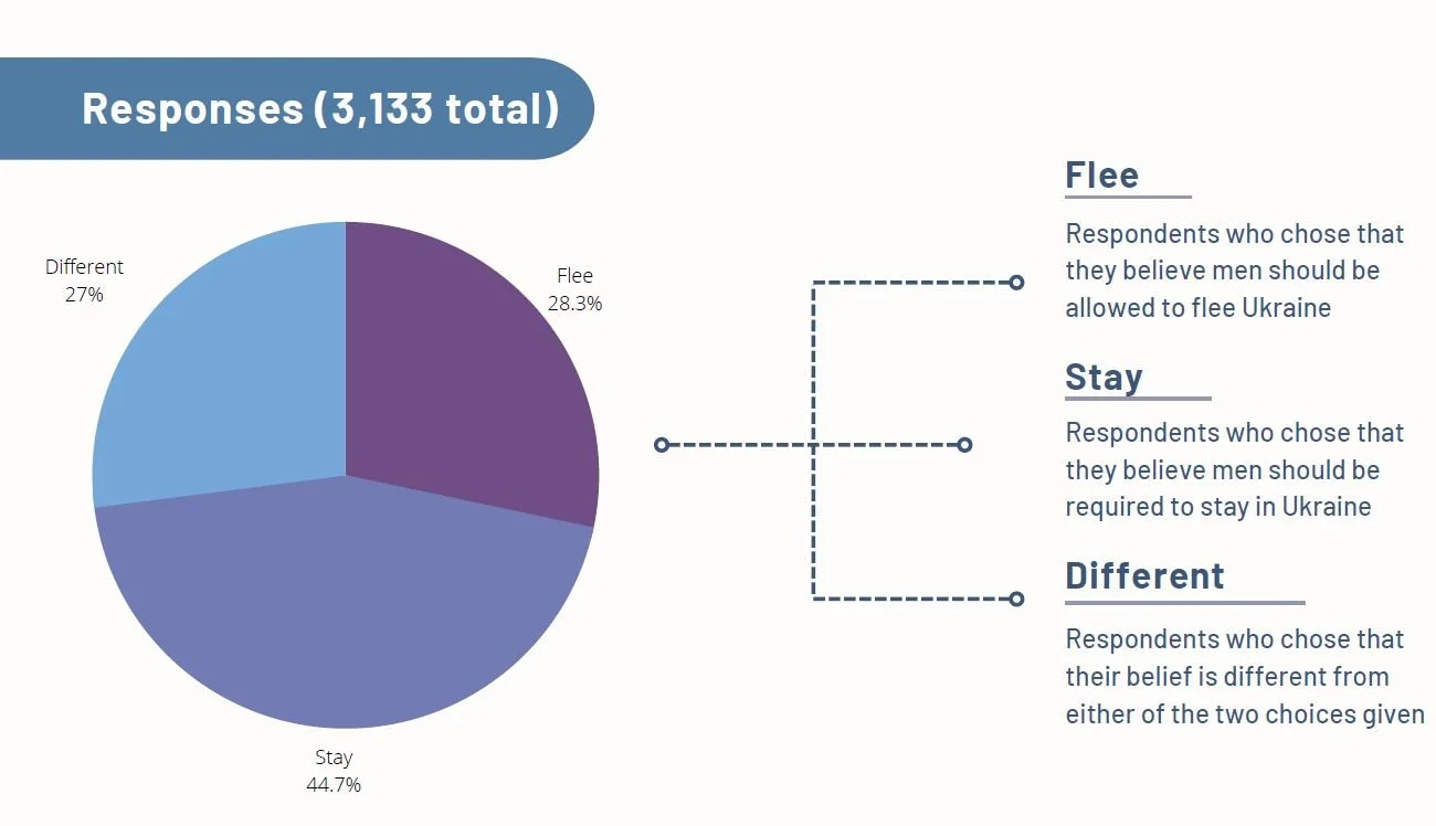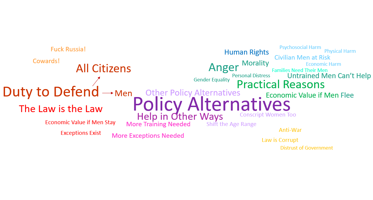 Human Security Lab’s research team analyzed over 700 unique comments from Ukrainians about why they believe civilian men should be required to stay, allowed to flee or “something different.” All three groups converged on the idea that the travel ban was not necessarily helpful to the war effort and numerous policy alternatives exist.